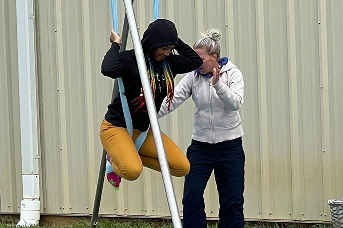 Aerial allows you to be you, to express yourself whether you choose to float or fly. The strong, supportive fabric offers you the opportunity to move in any way you choose, building confidence and promoting body positivity. Moving or restoring in the swing can provide a deep sensory experience and an opening for you to connect with your body. With aerial, the possibilities are boundless.